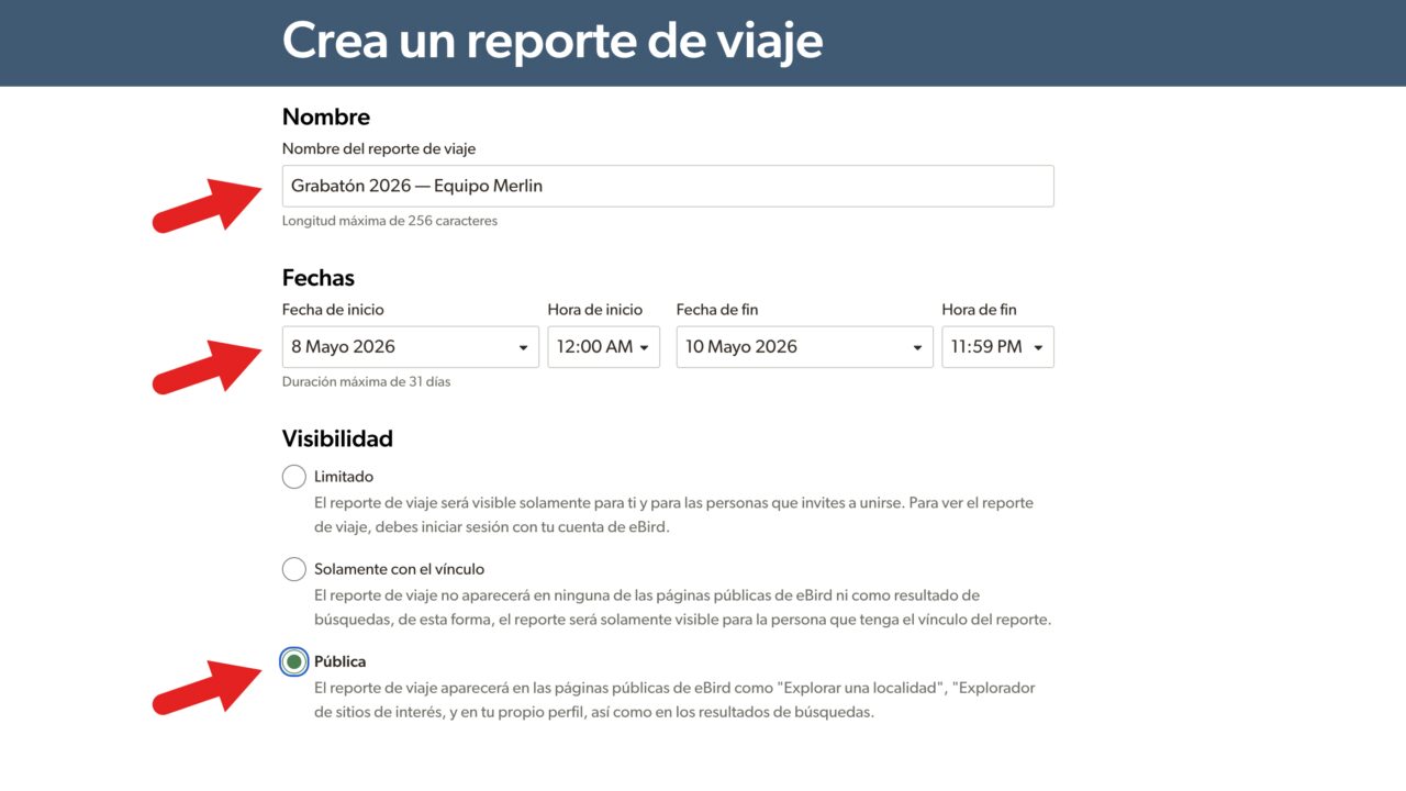 • Nombre → Ej: Grabatón 2026 – Equipo Aves del Sur