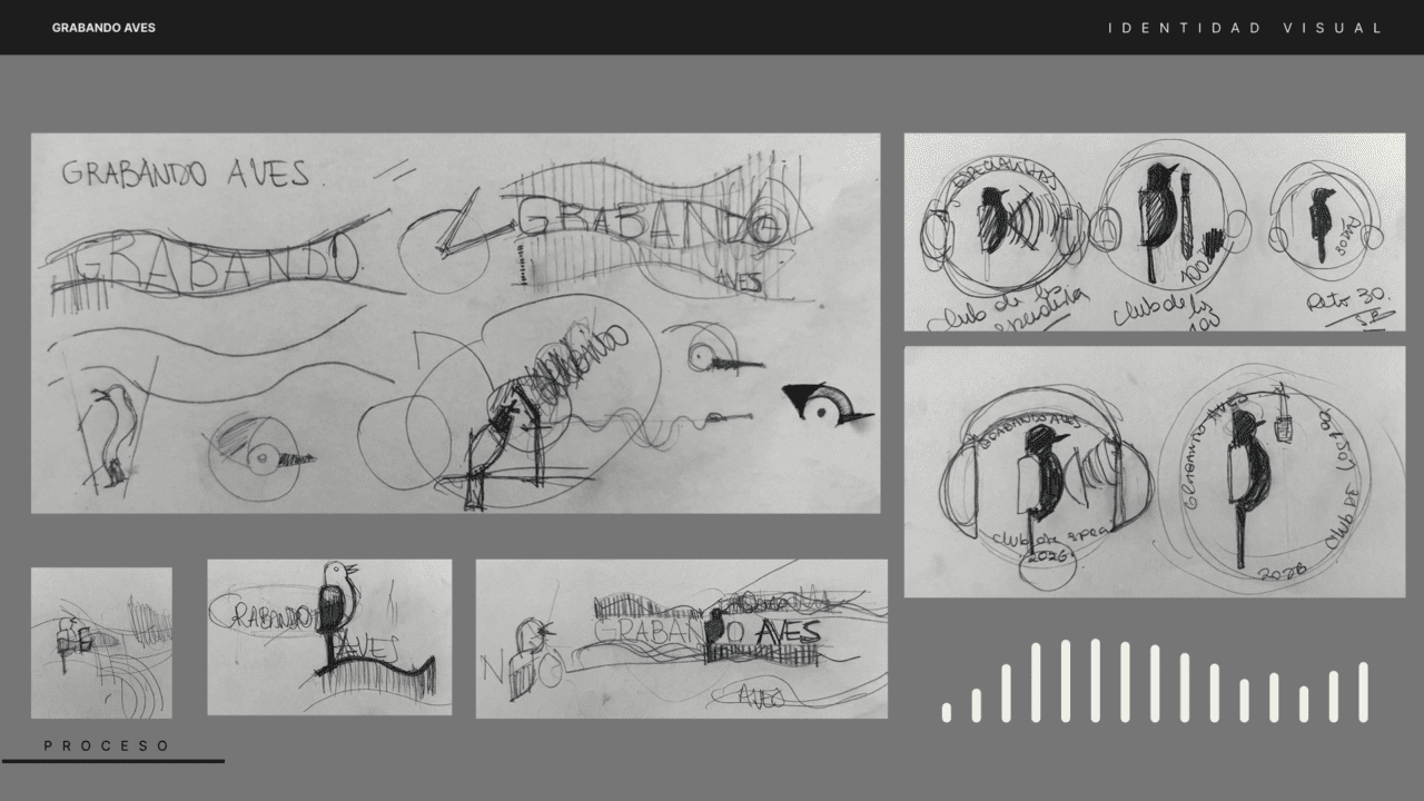 El proceso comenzó con una reunión inicial con Priscila Pellissier Pérez y Fabricio Gorleri, quienes las convocaron para diseñen la identidad visual de Grabando Aves. En esta primera reunión se compartieron los objetivos y alcances del proyecto. De ese primer intercambio surgieron conceptos clave que guiaron el desarrollo creativo: comunidad, aves y sonidos. Estas palabras no solo marcaron el rumbo estético, sino también el enfoque conceptual de la identidad.